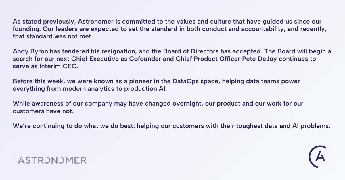 जैसे ही विवाद बढ़ा, कंपनी की ओर से एंडी बायरन को पहले छुट्टी पर भेज दिया गया। अब एंडी ने खुद CEO के पद से इस्तीफा दे दिया। कंपनी ने लिंक्डइन पर एक पोस्ट करके यह जानकारी दी। पोस्ट में लिखा गया “हमारे लीडरशिप से उम्मीद की जाती है कि वो आचरण और जिम्मेदारी में एक उदाहरण पेश करें। हाल ही में ऐसा नहीं हो पाया। एंडी बायरन ने इस्तीफा दे दिया है और बोर्ड ने उनका इस्तीफा स्वीकार कर लिया है।”